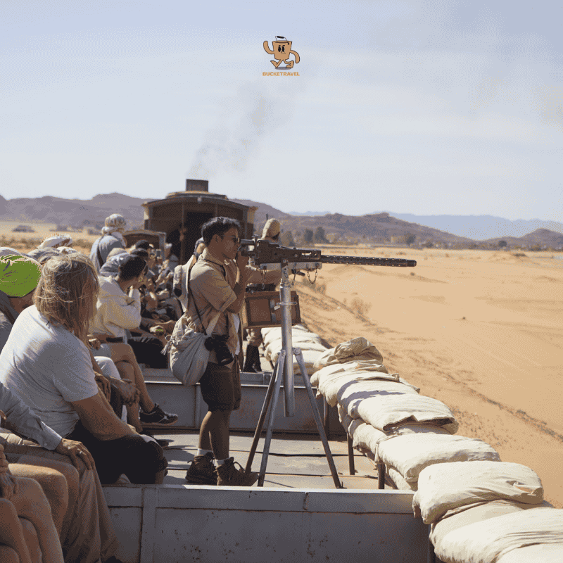 Đây không phải là một tour tàu mang tính tham quan hay hoài cổ đơn thuần, Journey Through 1916 là một “historical re-enactment experience” (trải nghiệm tái hiện lịch sử bằng người thật, bối cảnh thật, cho phép người tham gia “sống trong” một lát cắt của quá khứ) hoàn chỉnh, du khách được đặt vào bối cảnh chính trị-quân sự Trung Đông đầu thế kỷ 20 ngay tại vùng đất từng là chiến trường thật. Trong suốt hành trình kéo dài khoảng một giờ, những gì diễn ra không nhằm “kể chuyện” lịch sử mà buộc người tham gia phải cảm nhận lịch sử bằng giác quan: tiếng còi tàu, tiếng súng, bụi cát, vó ngựa và những khoảnh khắc bất ngờ diễn ra giữa sa mạc mênh mông.