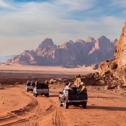 Bắt đầu ngày mới giữa Wadi Rum, băng qua thung lũng Mặt Trăng bằng xe jeep. Di chuyển đến Aquaba để ngắm biển, sau đó rời Jordan sang Ai Cập trong buổi tối.